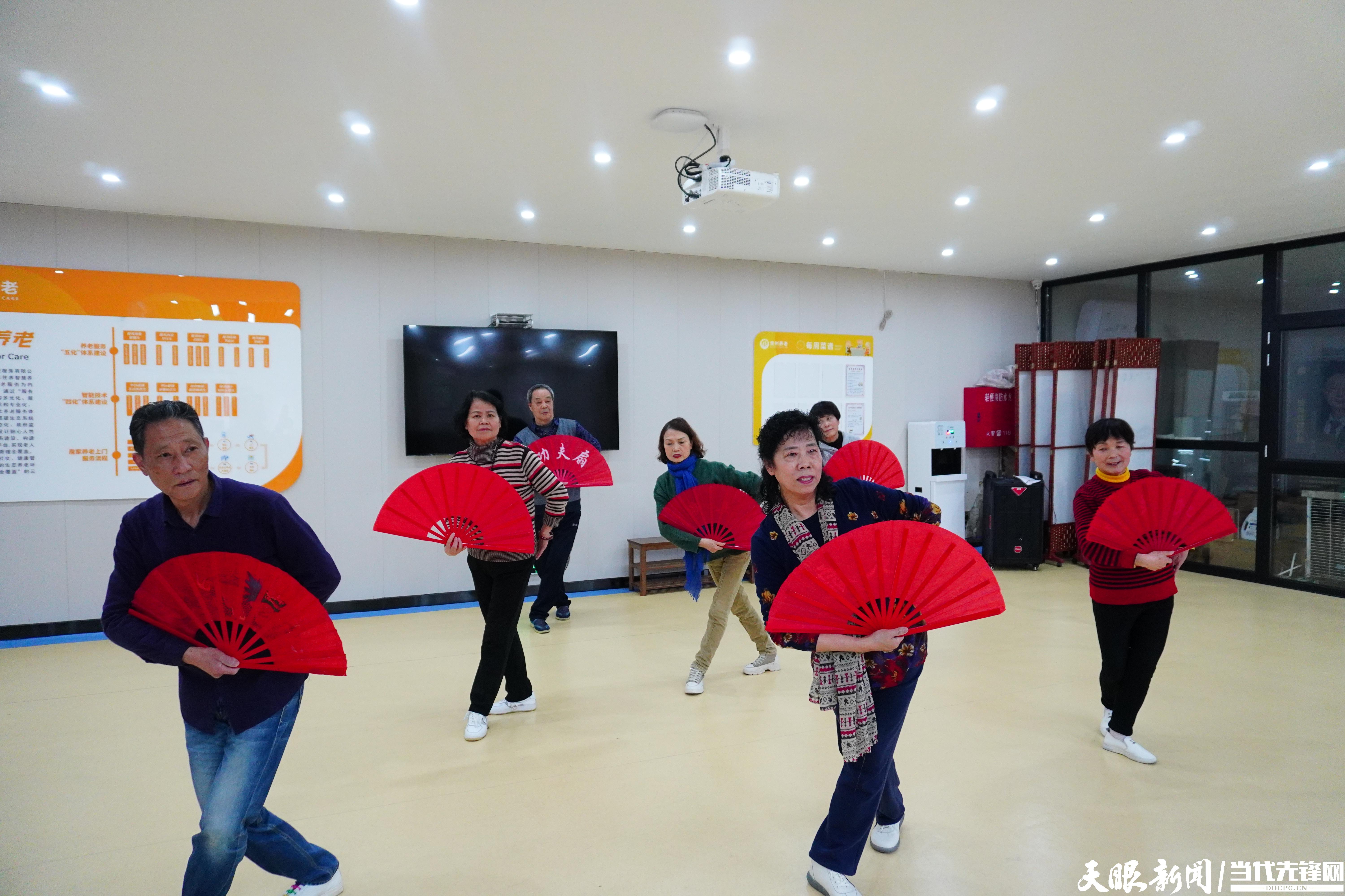 養(yǎng)老服務(wù)站里,老年人舞著功夫扇。