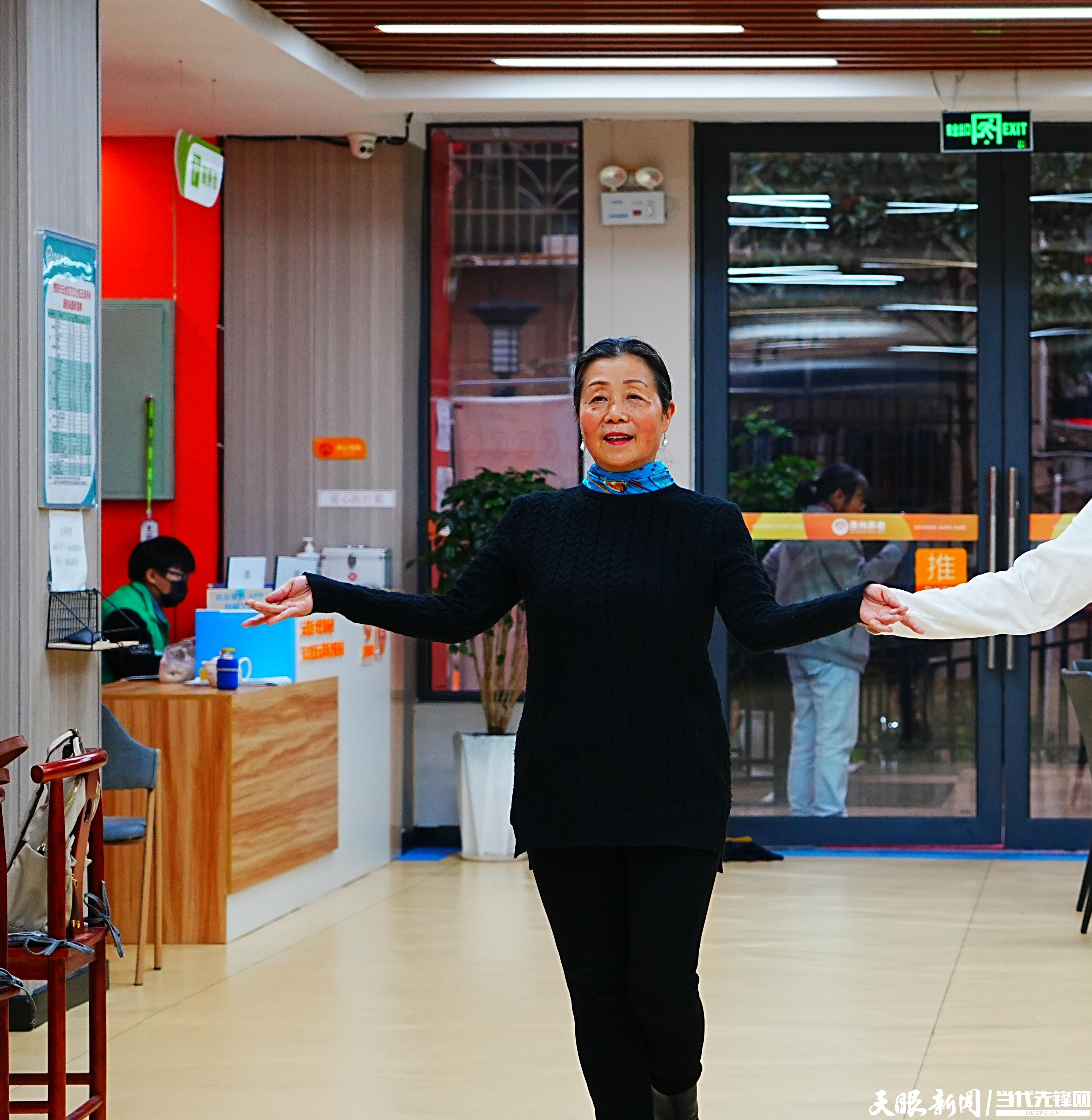 深冬的早上天氣寒涼,貴州省貴陽云巖區(qū)大營路街道萬江社區(qū)的養(yǎng)老服務(wù)站里卻歌舞喧天、氣氛熱烈。70歲的馬素蘭精神抖擻,身段靈活,和著音樂節(jié)拍教舞伴跳著交誼舞,“我上左腳你就撤右腳,跟著我的節(jié)奏來,一二三走!”